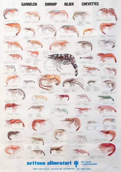 Questo poster didattico è una dettagliata tavola illustrativa sui crostacei, focalizzata sulle diverse specie di gamberi. Il titolo elenca il nome in diverse lingue (GARNELEN, SHRIMP, REJER, CREVETTES), indicando un uso internazionale o multilingue. La grafica presenta numerose illustrazioni scientifiche e precise di diverse varietà di gamberi, ognuna con dettagli minimi sulle caratteristiche, la provenienza e la dimensione. In basso, la pubblicità di "Nettuno Alimentari S.p.A." suggerisce che la tavola fosse destinata a un uso professionale, probabilmente in pescherie, ristoranti o nel settore della distribuzione alimentare, per aiutare a identificare e classificare correttamente i prodotti ittici.